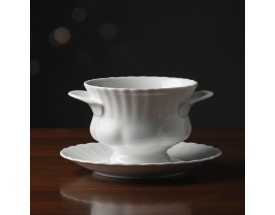 ChodzieżIwona Biała.Bulionówka odlewana porcelanowa ze spodkiem.pojemność: 300 ml ,średnica spodka: 17 cm,materiał: porcelana.