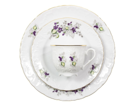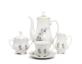 Ćmielów.Rococo.Fiołki.Serwis porcelanowy do kawy dla 6 osób / 18 elementów.Skład serwisu:6 x filiżanka do kawy 250 ml,6 x spodek do filiżanki 15,7 cm,6x talerz deserowy 17 cm.materiał: porcelana.