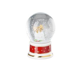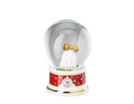 Szklana kula śnieżna na porcelanowej podstawie. Zapakowana w czerwone świąteczne pudełko będzie miłym prezentem pod choinką.