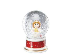 Szklana kula śnieżna na porcelanowej podstawie. Zapakowana w czerwone świąteczne pudełko będzie miłym prezentem pod choinką.